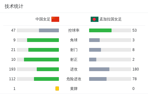 北京时间3月3日女足亚洲杯 小组赛 第1轮,中国女足对阵孟加拉国女足。上半场王霜率先头球破门,但因越位被吹,随后王霜超级世界波破门,张睿补时阶段再入一球。下半场双方均无建树,最终比分中国女足 2-0 孟加拉国女足。